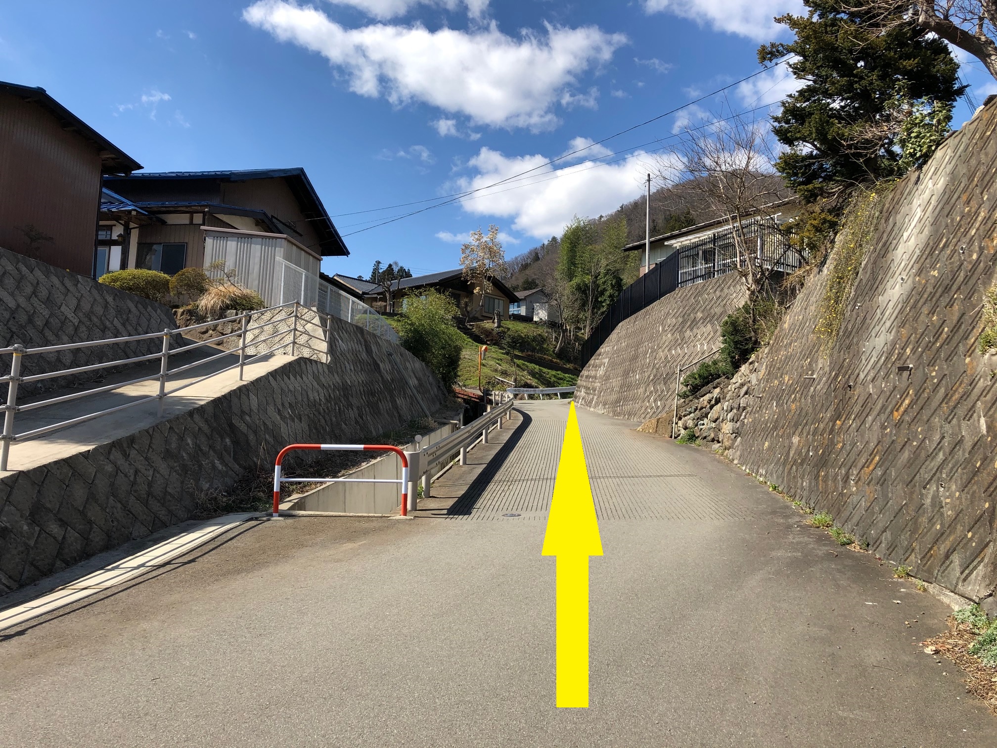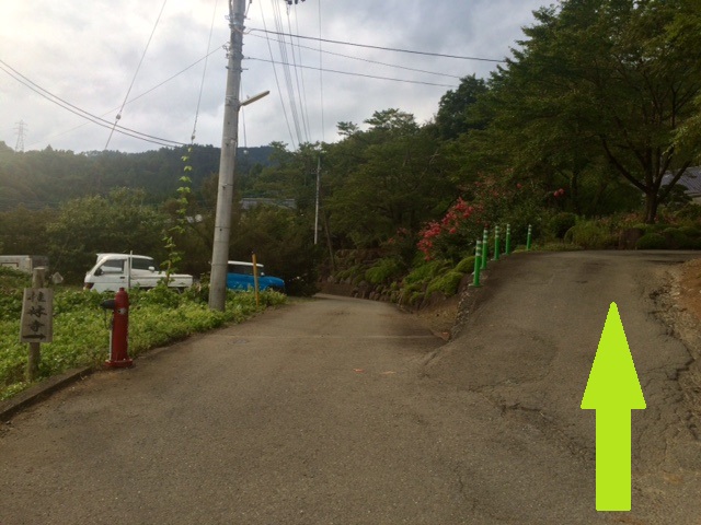 緑色のポールが並ぶ細い坂道を上がる。 左側に見える敷地が駐車場。